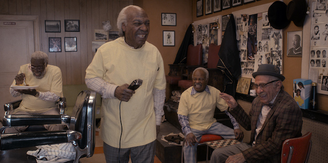 Back in the sequel’s present day, when Akeem and Semmi return to Queens, their first stop is the My-T-Sharp barbershop they had frequented 30 years earlier. Barbers Clarence (Murphy), Morris (Hall) and Sweets (Clint Smith) — along with their perennial visitor, Saul (Murphy again) — look as though they’ve neither moved nor aged in the past three decades. With their introduction, the sequel’s filmmakers managed what the original’s had needed to creatively avoid: showing all four characters in a single shot, which here unfolds with a camera move that reveals each in turn before landing on a wide shot of the group.